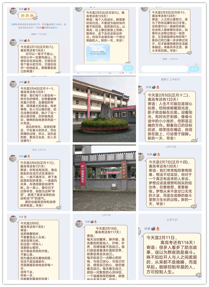 各班全力配合教学工作的同时,以倡议书,家长信,简讯,美篇各种方式对学生进行假期居家与学习指导,结合家长的监督充分利用假期培养学生自律品质,受到家长的广泛赞誉。我们高三,尤其注重对高三年级学生的精神鼓舞,通过每日高考倒计时发送和每日温馨鼓励语相结合,旨在鼓励高三学子切勿懈怠、每日进步。