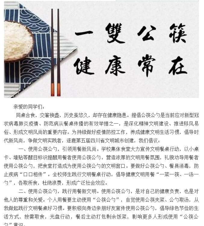 餐桌举止非小事,一筷一勺见文明。为推行“公筷行动”,近期,安仁中学根据大邑县精神文明建设办公室《关于在全县开展‘舌尖上的防疫战’——健康美食 文明之城行动实施方案》精神,在全校师生中开展了“牵手家校用公筷 促进健康向未来”的活动。