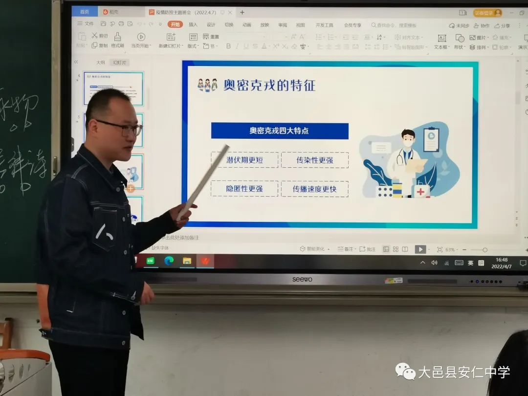 疫情就是教材。班会课上,同学们再次对病毒的特征和有效防疫的相关知识进行全面、深入的了解。班主任老师为同学们细致讲解了“奥密克戎”的四大特点。老师们强调,奥密克戎病毒潜伏期更短、传染性更强、隐匿性更强、传播速度更快,有着可能比德尔塔病毒在空中存活更长时间、更有效地侵入人体细胞、更深地潜入人体细胞内的预警机制、增加患者呼吸和咳嗽时释放的病毒含量等特点,提醒同学们不能对“奥密克戎”掉以轻心。
