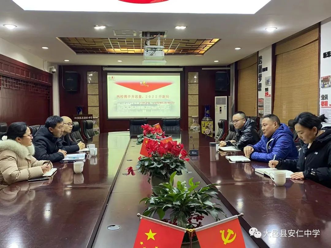 仁和园内谋新篇 本学期伊始,大邑县安仁中学携手大邑县三岔中学商议2022年两校“强校工程”结对帮扶活动计划。安仁中学党总支副书记、初中部校长李涛,初中部教务分管武勇、德育分管李柳,三岔中学校长冉魏一行参加了本次会议。