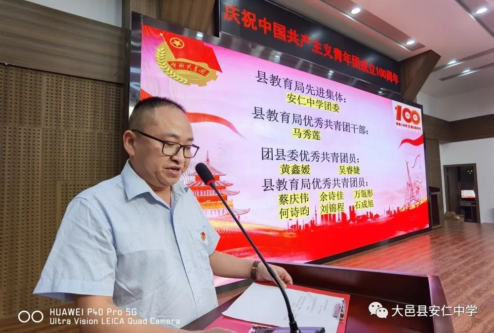 安仁中学党总支青年委员、副校长文虎宣读了县级共青团表彰名单,党总支书记、校长郭文莉,副书记李涛为获此殊荣的青年师生颁发了奖状。