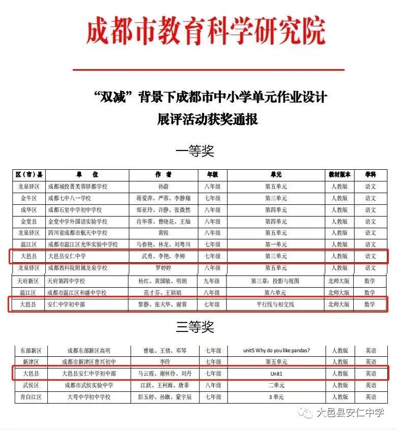 为深入贯彻《中共中央办公厅 国务院办公厅关于进一步减轻义务教育阶段学生作业负担和校外培训负担的意见》《教育部办公厅关于加强义务教育学校作业管理的通知》《四川省教育厅关于进一步做好义务教育学校考试和作业管理的通知》等文件精神,落实新课标修订理念,提高全市教师作业设计能力,丰富市域优质作业资源,促进教学质量提升,成都市教育科学研究院于2022年4-5月开展了“双减”背景下成都市中小学单元作业设计展评活动。 安仁中学初中部高度重视,以“减负、提质、增效”为教学愿景,各学科教研组积极参与作业设计,团队教师通力协作,深研细磨,最终, 语文组武勇、李艳、李柳三位老师协力设计的七年级人教版教材第三单元作业设计荣获一等奖! 数学组张谊、黎静、刘会、谢蓉四位老师的作品七年级北师大版教材《平行线与相交线》作业设计在本次展评活动中荣获一等奖!