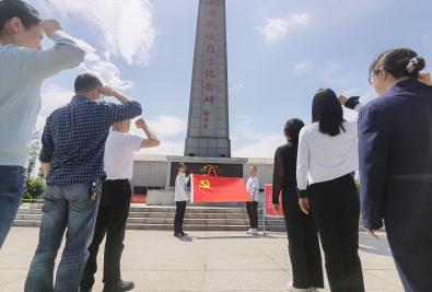 雅安百丈关战役纪念园庄严肃穆,园区入口处的题词“英勇奋进的红军万岁”仿佛在无声诉说着那段光辉历史和革命烈士的感人事迹。革命烈士纪念碑高高耸立,碑上镌刻的徐向前元帅题词“百丈关战役烈士纪念碑”十个大字在阳光下熠熠生辉。安仁中学全体党员在纪念碑前整齐列队,全场肃立,向革命烈士默哀。伴随着深情的《献花曲》,副校长杨煜蘅、孔祥明抬起花篮,缓缓走上台阶,将花篮摆放在革命烈士纪念碑前。党总支书记郭文莉缓步登上台阶,整理写有“革命烈士永垂不朽”的花篮缎带。全体党员行三鞠躬礼,表达对革命烈士崇高的敬意和深深的怀念。